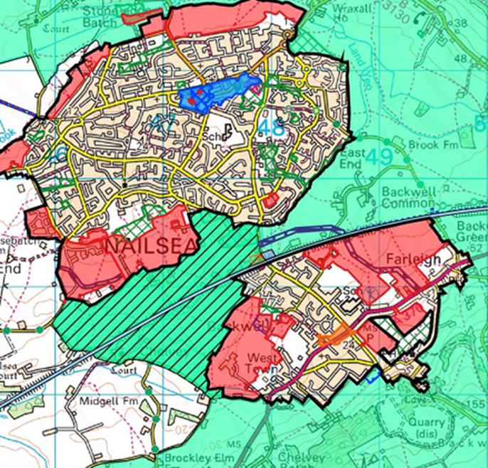 The white areas in Backwell are the Playing Fields, Backwell School Playing Fields and Backwell Allotments